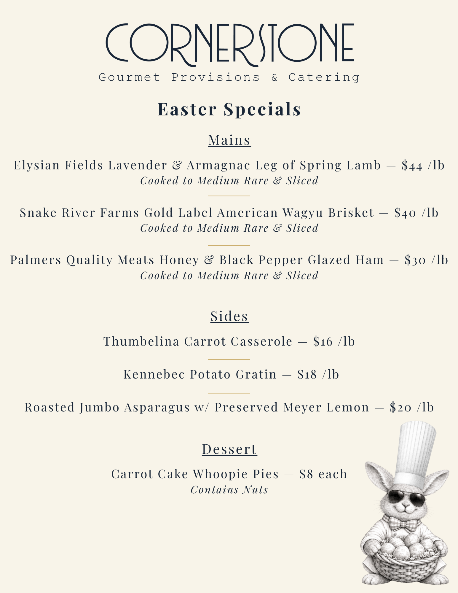 EASTER, ELEVATED. Chef Bryan's Spring-inspired menu brings all the warmth of Easter classics, reimagined with his signature elevated touch.effortless for you, unforgettable for everyone at the table. CHECK OUT OUR EASTER MENU & PLACE YOUR ORDER THROUGH THE FORM BELOW View fullsize PLACE YOUR ORDER THROUGH THE FORM BELOWor send an email to info@cornerstonegourmet.com