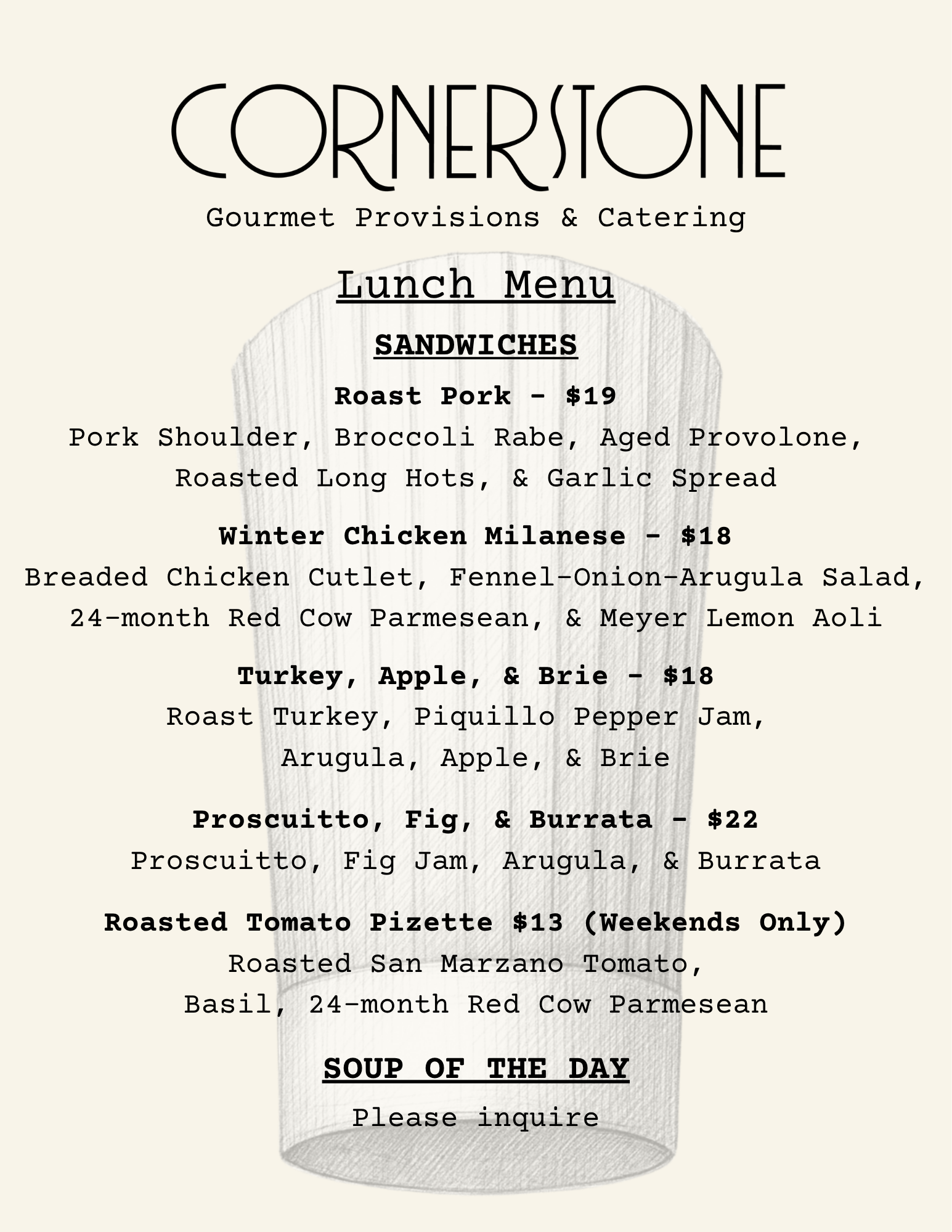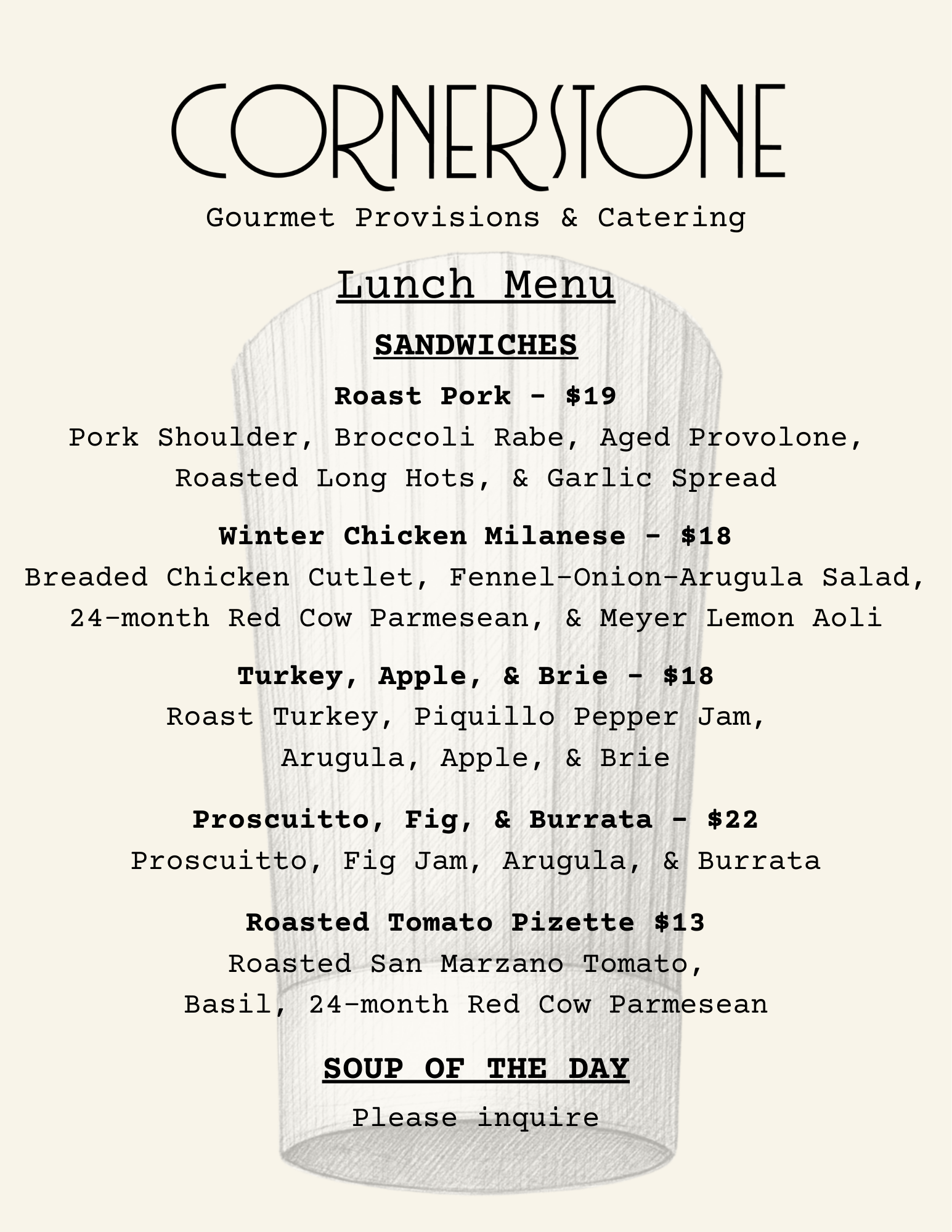 Please send an email to info@cornerstonegourmet.com if you have any questions or catering requests.