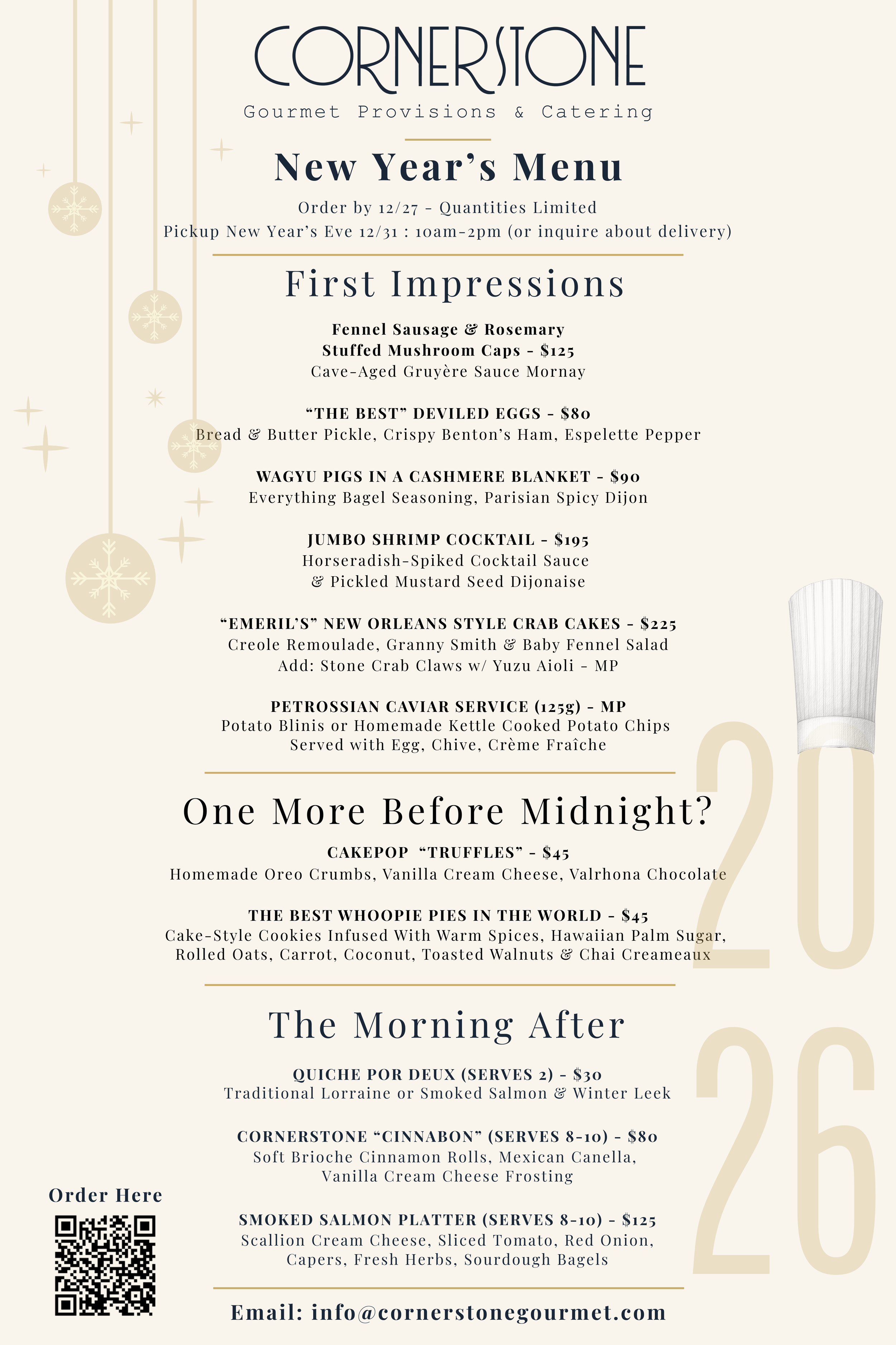 Impress your guests & welcome 2026 the right way, with elevated selections from Cornerstone Gourmet Provisions & Catering